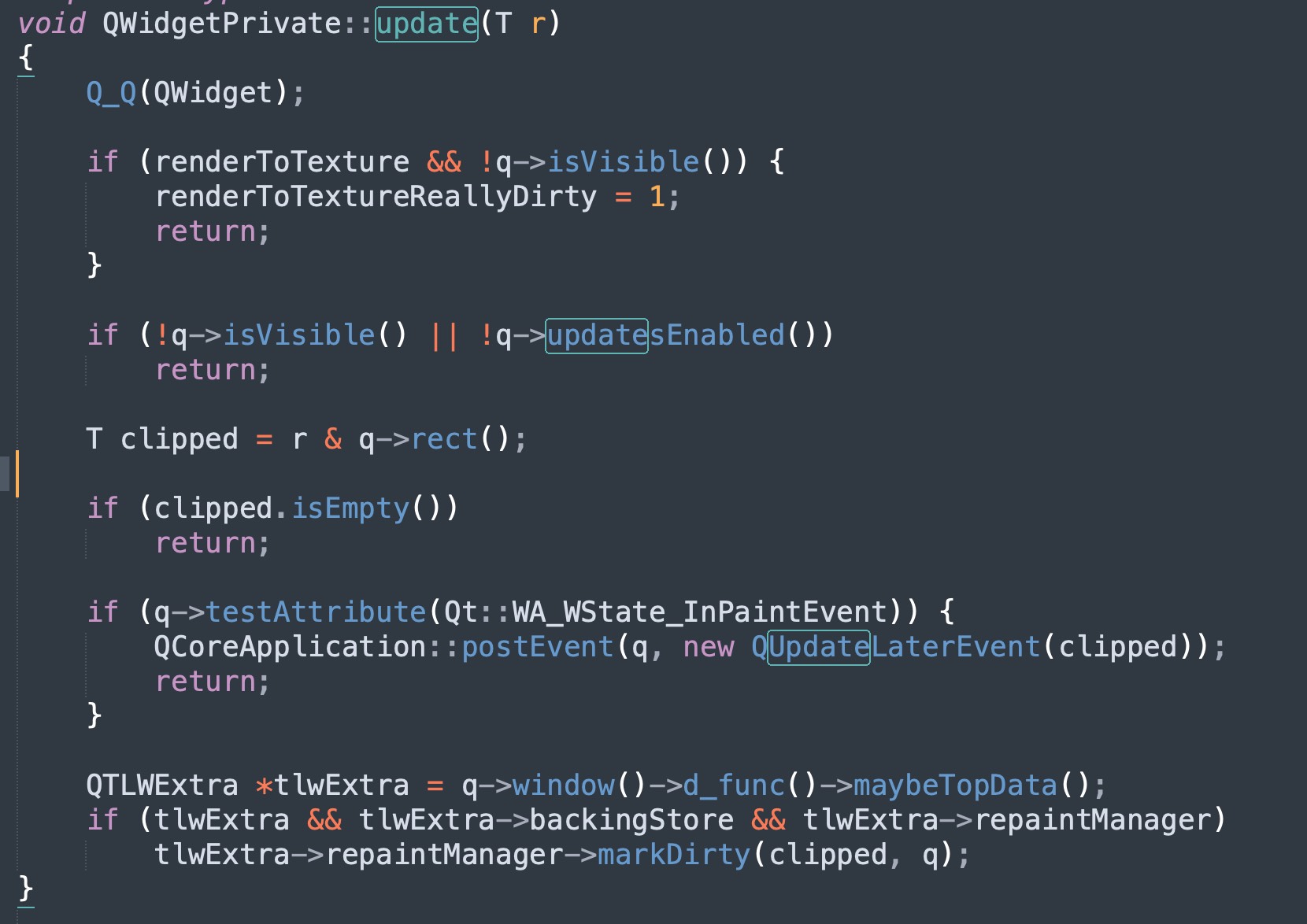 QWidget.update(rect)调用私有类的方法QWidgetPrivate.update(rect)QWidgetPrivate.update(rect)首先判断 widget 是否需要绘制。如果不需要,则直接返回。比如 widget 不可见、update 被禁用、参数 rect 与 widget.rect 无交集,这些都不需要绘制。如果已经正在绘制过程中,就向程序全局QCoreApplication发布一个 UpdateLaterEvent 事件并返回。如果需要绘制,则在顶层窗口(TLW: Top Level Widget),将该 widget 需要绘制的 clipped 区域标记为脏。tlwExtra→repaintManager→markDirty(clipped, q)