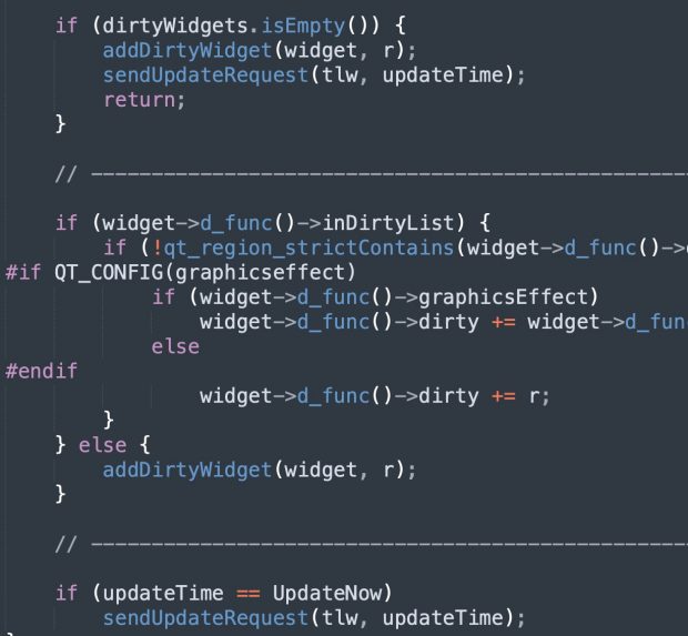 2、而我们在上文说过,QWidget.update(rect) 方法不会立即绘制,而是先在顶层窗口 tlw 将该区域标记为脏。然后由 tlw 响应全局 UpdateRequest 事件,再一层一层往下传递绘制。