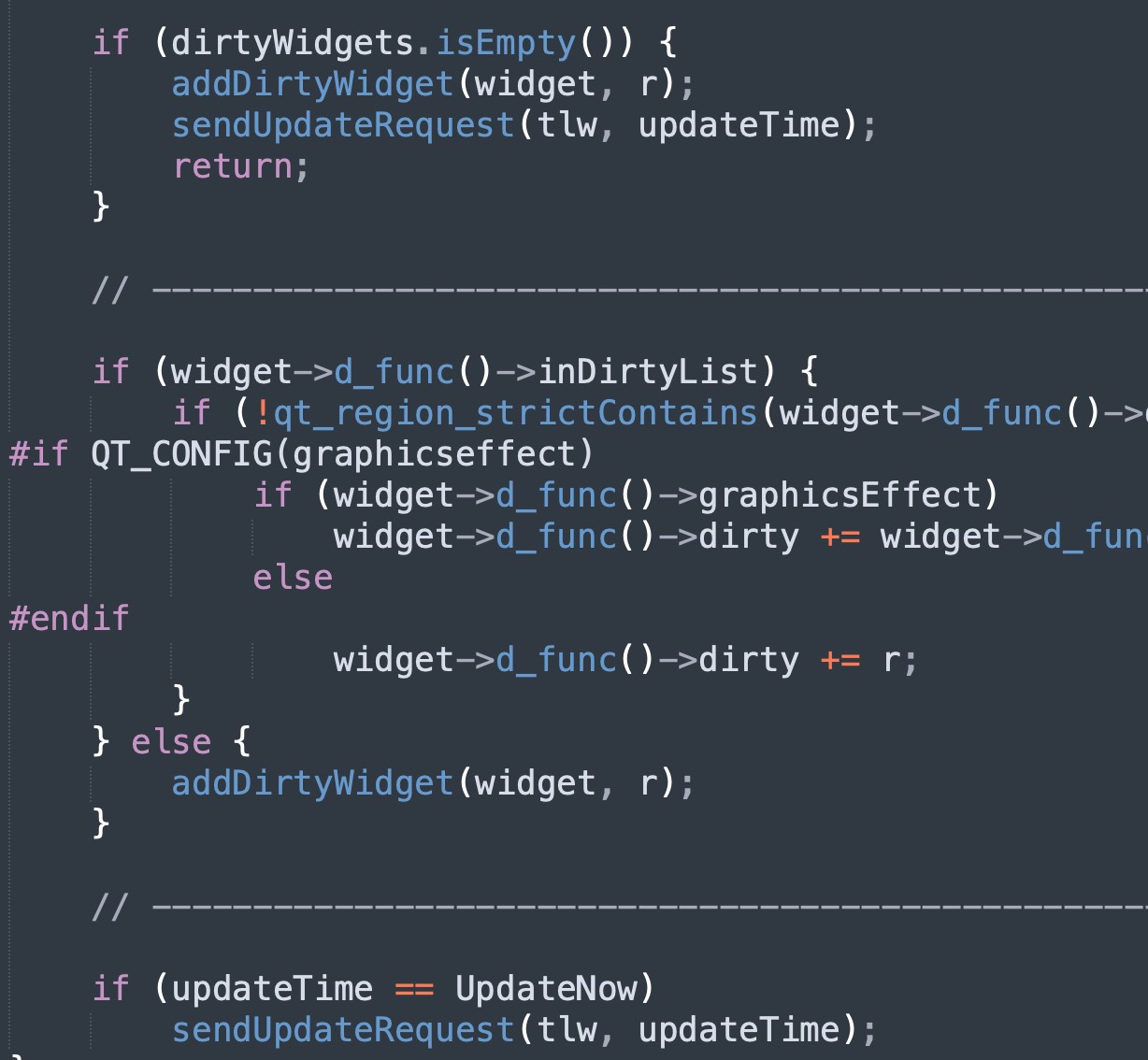 然后将 widget 以及需要重绘的区域加入 tlw 的 dirtyWidgets 列表( addDirtyWidget(widget, r) )。顶层窗口 tlw 发布重绘请求 sendUpdateRequest(tlw)。