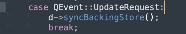 QApplicationPrivate::notify_helper(QObject *receiver, QEvent * e)负责将QEvent::UpdateRequest事件交给顶层窗口 tlw (我猜的)的QWidget.event()分发处理。 QWidget.event()调用QWidgetPrivate::syncBackingStore()处理QEvent::UpdateRequest事件。