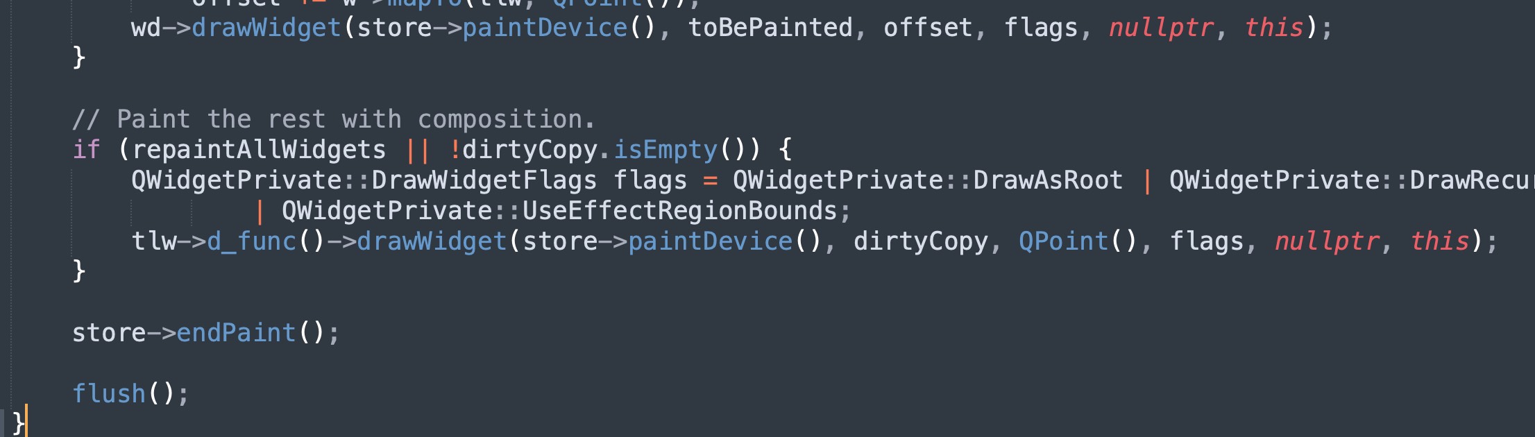 QWidgetPrivate::syncBackingStore()>>QWidgetRepaintManager::sync()>>QWidgetRepaintManager::paintAndFlush()负责最终的 paint(QWidgetPrivate::drawWidget()) 与 flush(QWidgetRepaintManager::flush())。我理解的是,paint 是指在“Qt 画布”上绘制出图像,flush 是指将内存画布上的图像冲洗到“显卡画布”上(flush 就跟各操作系统的显示驱动有关了)。