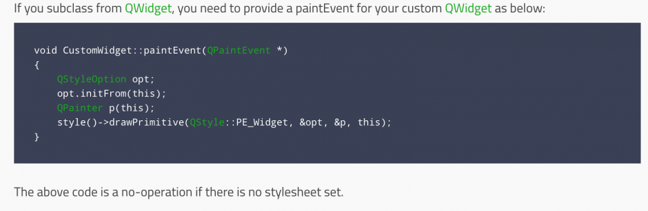 根据官方文档的说明,如果希望自定义的 QWidget 派生类能够响应 StyleSheet 中定义的样式,就必须用如下代码重写 paintEvent() 方法。(其实应该叫做实现 paintEvent(),因为 QWidget::paintEvent() 本来是个空函数,啥都没做)
