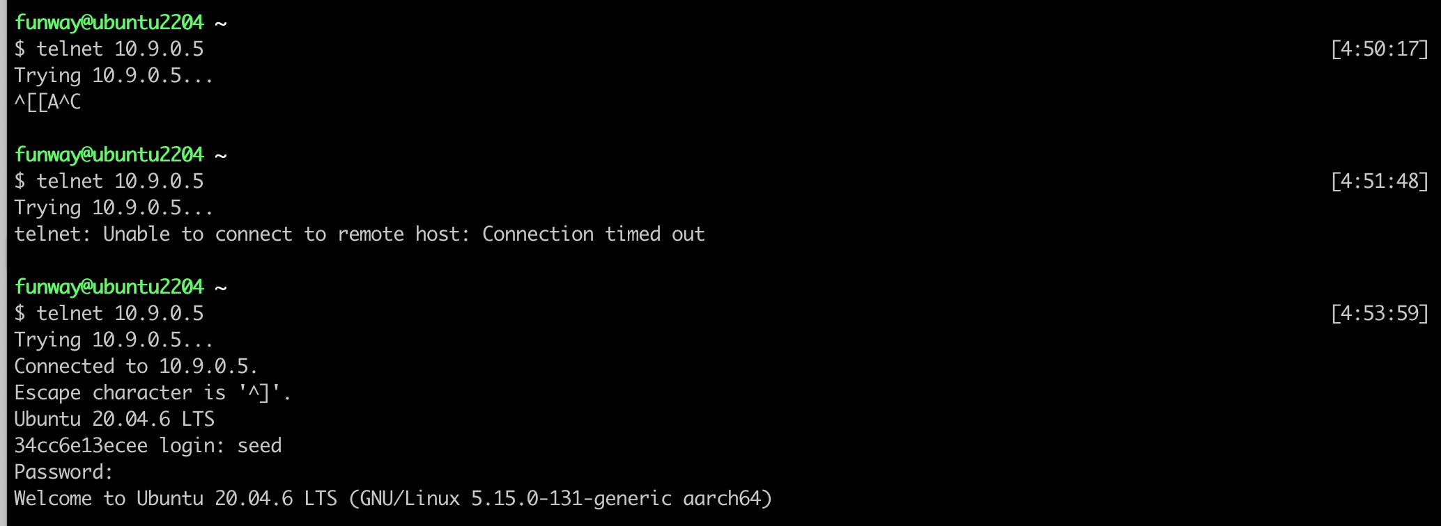 2. At this point, attempting to Telnet into the victim container will mostly fail, with only a small chance of connecting successfully before timing out. (C program is really far more efficient than Python!)
