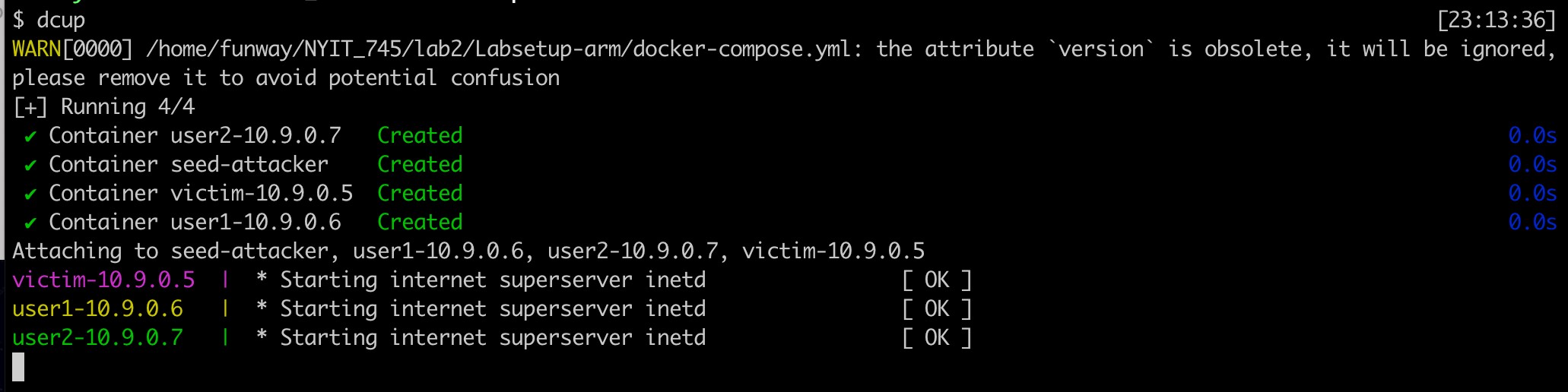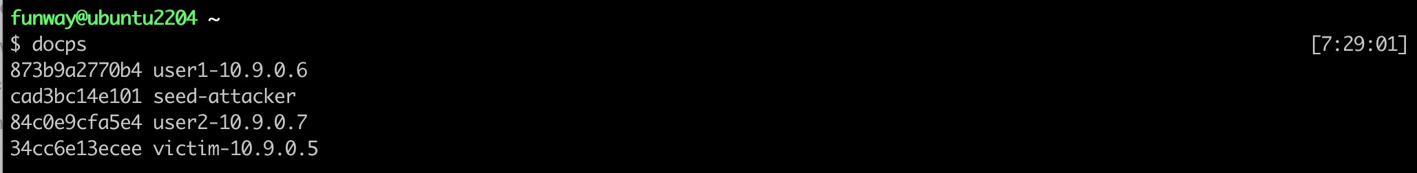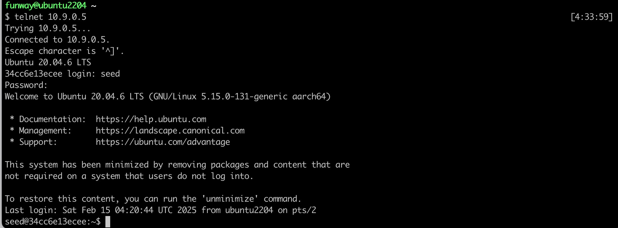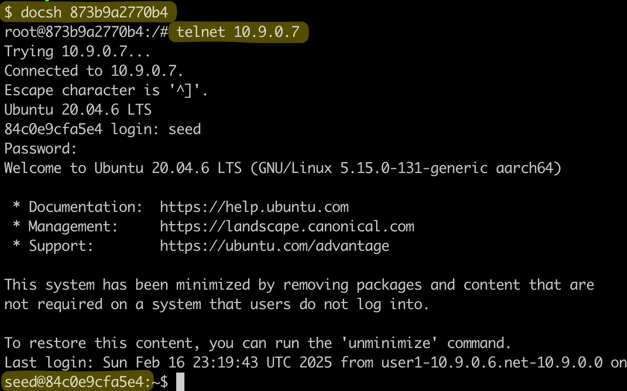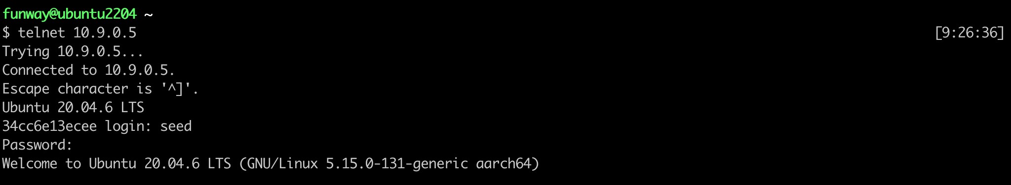 1. We continue to use the Task 2 environment, that is, Telnet from the user1 container to the user2 container, and then launch sniffing and attack on the docker host (Ubuntu).