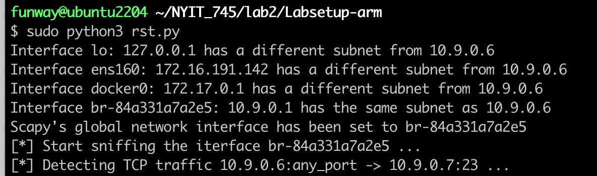 4. Write an automatic RST attack script rst.py and run it on the docker host Ubuntu using sudo python3 rst.py.