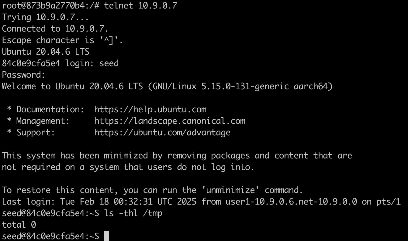 1. Telnet from user1 to user2 container and check the /tmp/ directory.