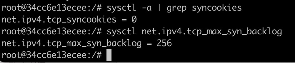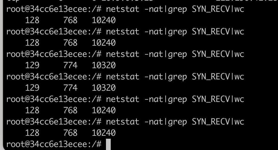 1. Start multiple python synflood.py processes to attack the victim container, then check the number of SYN_RECV half-connections on the target container, most of the time kept at 128 (why not close to 256?)