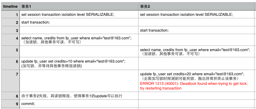 上面代码中,调用session的get()方法时的第三个参数LockOptions.UPGRADE就表示使用悲观锁读取数据。翻译成sql语句就是”select * from fp_user where id = :id for update“。上面这段代码的执行步骤如下表所示: