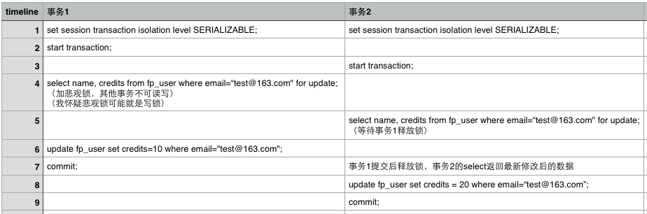 显然,依靠SERIALIZABLE隔离级别无法实现我们的目标。要真正搞懂事务的隔离性,必须得结合数据库的加锁机制来看,更多的关于数据库加锁机制,不在本文的讨论范围(当然我现在也没搞懂,没好好学数据库=。=)。只是在搜索答案的时候发现有人提到乐观锁悲观锁的概念,便尝试在上面的代码中给读取用户信息加悲观锁。