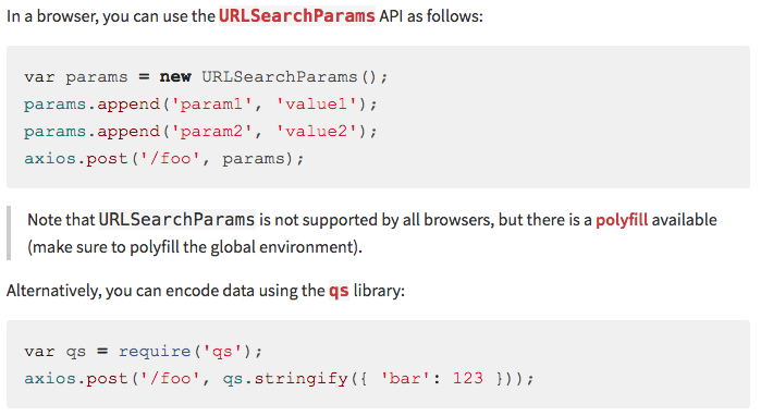 以Vue.js的axios为例,参考axios – Using application/x-www-form-urlencoded format。