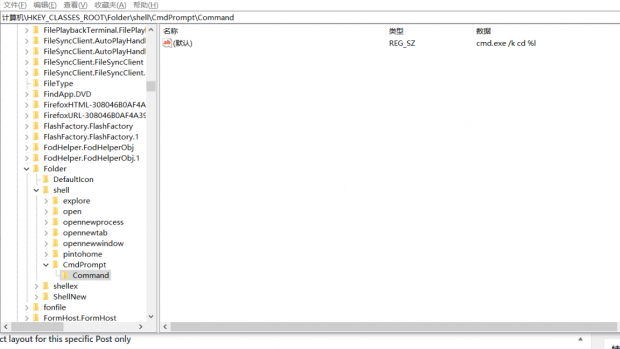 在CmdPrompt下新建Command项,(默认)字符串值为: