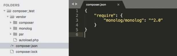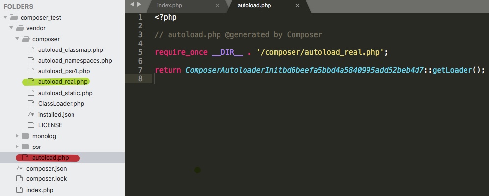 - /vendor目录 是composer下载到的依赖包所存放的目录。(为什么当前/vendor目录下除了monolog还有composer与psr文件夹呢?因为monolog依赖于psr/log包,而composer文件夹则是存放实际负责类自动加载的函数。)