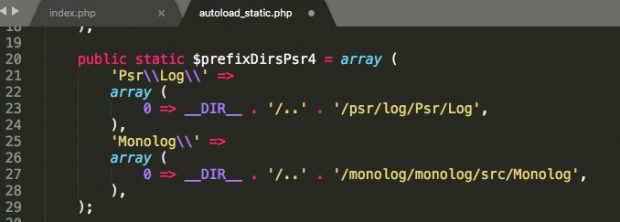 - 调用./autoload_static.php,该文件包含了依赖包命名空间与源码目录的对应关系。并将这些对应关系写入./ClassLoader实例中。(autoload_static.php的作用等同于另外三个文件autoload_classmap.php, autoload_namespaces.php, autoload_psr4.php之和。根据php版本的不同,也有可能是调用那三个文件。)
