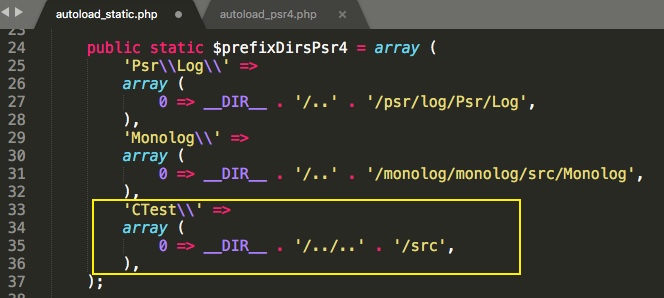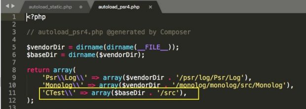 我们可以观察到/vendor/composer/目录下的autoload_static.php与autoload_psr4.php都加入了刚写的命名空间。