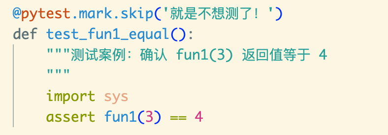 # 运行 pytests 目录下的测试用例,并打印详细结果 pytest.main(['pytests', '-v']) # 运行 pytests/test_constants.py 模块的测试用例,只打印精简结果 pytest.main(['pytests/test_constants.py', '-q']) # 运行 pytests/test_sample.py::test_fun1_equal 测试函数,打印详细结果,并且不吞掉源代码本来的输出 pytest.main(['pytests/test_sample.py::test_fun1_equal', '-v', '-s']) ## 注意 ## # 不建议在同一个文件中,连续多次调用 pytest.main(),最好只使用一次。