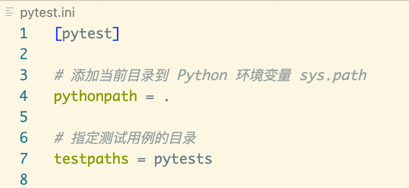 python test.py而是在根目录下运行pytest命令,那么系统并不会将当前路径加入到 Python 的 sys.path 环境变量中。这时候就需要在配置文件中指定pythonpath = . - testpaths 指定测试用例的目录