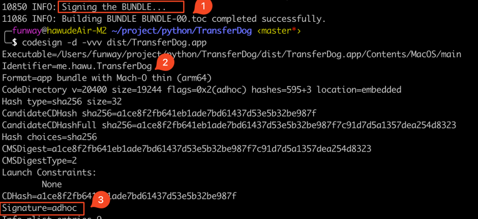签名成功后,使用 codesign 命令检查 app 包,可以看到 Identifier 已经正确变成了指定的 bundle id。另外 Signature 签名方式显示的是 adhoc,这个大概可以理解为 “特定的,开发测试版本,无需认证”。