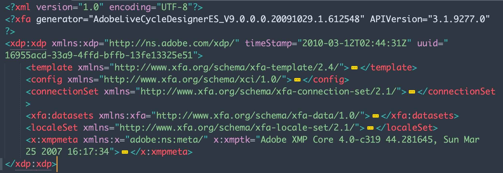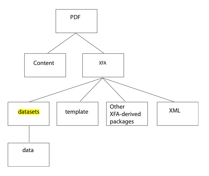 The XFA structure in PDF was saved as an XML Data Package (XDP). It looks like the following picture.