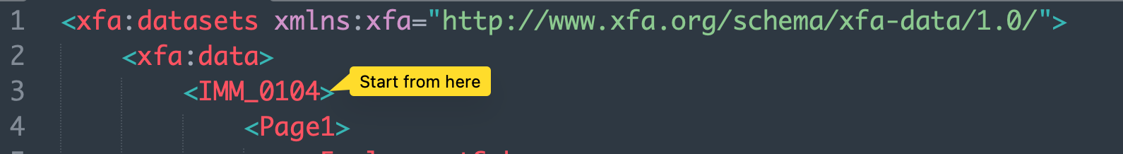 But remember! Do not keep the <xfa:datasets> and <xfa:data> tags in the XML file if you fillXfaForm from an XML file, just start with the next level behind <xfa:datasets> <xfa:data>.