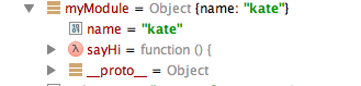 myModule是一个对象,它有一个name成员属性,一个sayHi成员函数,以及一个__proto__原型对象。