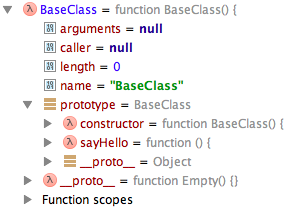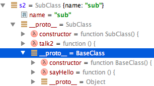 另外有个很重要的一点,在inherits(SubClass, BaseClass)之前定义的s1对象,它的原型仍然是旧的SubClass,而不是新的继承了BaseClass.prototype的SubClass。原因是因为javascript的对象是引用类型的。s1.__proto__指向对旧的SubClass.prototype的引用,而当inherits继承后,SubClass实际上是新建了一个prototype对象,旧的prototype则游离在内存中,仍被s1引用。而后所有新建的SubClass对象则是引用新的SubClass.prototype。并且新建的s2对象内部构成一个原型链:s2.__proto__(=SubClass.prototype).__proto__(=BaseClass.prototype).__proto__(=Object)。因此s2可以调用到SubClass.prototype上定义的属性和BaseClass.prototype上定义的属性。