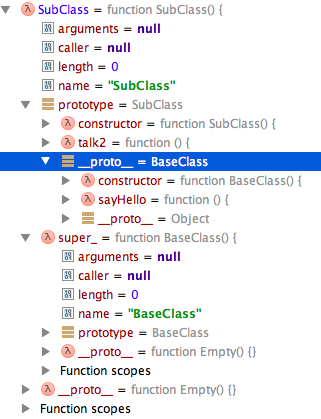 由上图可以看出,util.inherits(SubClass, BaseClass)后,SubClass.prototype.__proto__由之前的基本Object对象变成了BaseClass.prototype,并且为SubClass定义了SubClass.super_属性,该属性指向BaseClass函数。