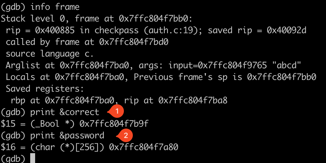 - Saved registers: 表示当前函数中保存的上一层 caller 函数的寄存器(函数返回时需要用到)。随后的 rbp at 0x7fffffffe3c0, rip at 0x7fffffffe3c8 表示这两个寄存器在栈中的地址。使用命令