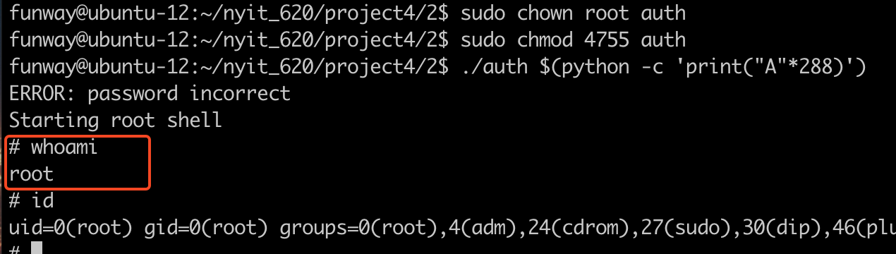 这是我们并没有将 auth 可执行文件设置成 root-owned setuid。而代码中的 setuid(0) 函数, 并不是简单的让进程变成 root 权限的意思,它还需要根据当前进程的 uid 来判断是否可以成功执行。所以我们必须先将 auth 可执行文件设置成 root-owned setuid,然后代码里的 setuid(0) 才能成功的将 ruid, euid, suid 设置成 0,即 root 权限。这时候再以 system("/bin/sh") 函数调用的 shell 就会以 root 用户启动。