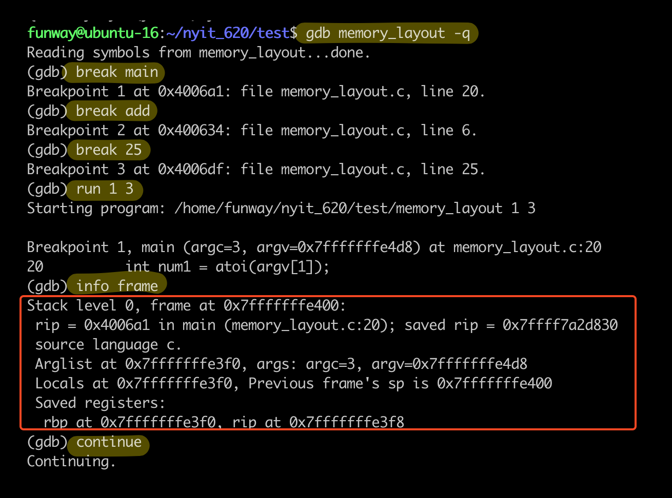 - rip = 0x400674 in add (memory_layout.c:14) 表示当前指令指针(Instruction Pointer)指向的地址,同时后面给出了解释是在 ad 函数,以及在 memory_layout.c 代码中的第14行。