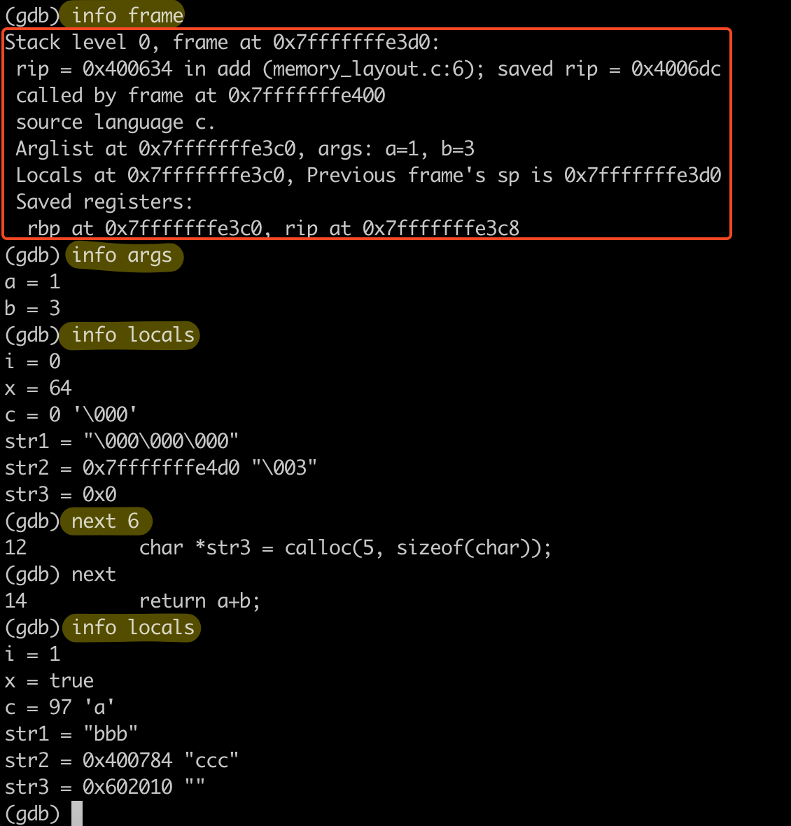 (gdb) up,(gdb) down来切换栈帧。也可以用(gdb) backtrace来查看调用链。 - frame at 0x7fffffffe3d0 表示当前栈帧的起始地址,或者叫帧地址(Frame Pointer)。它通常会等于下面的 Previous frame’s sp (Stack Pointer),即上一个栈帧的栈顶地址。