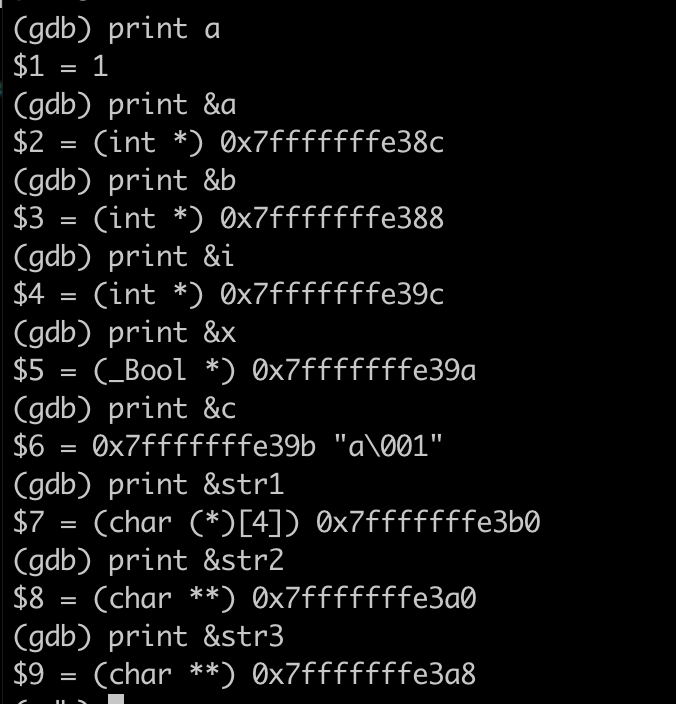 然后,再使用 (gdb) print var 命令来打印指定变量的值或者地址。