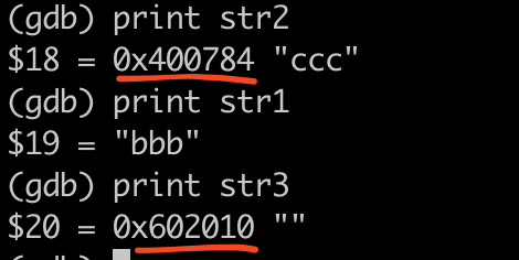 另外,由于 str2, str3 是字符串指针,它们的实际数据是保存在堆中的!堆的地址要远低于栈地址。