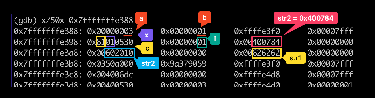 (gdb) x/2x 0x7fffffffe3c8会发现该地址上存储的值就是上面出现的 saved rip。而 saved rbp 值则指向上一层栈帧的局部变量起始地址(不是应该指向上一个栈帧的 EBP 吗? confusing… (・・ ) ?)。