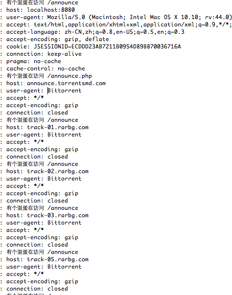 然后google了一下bt协议,发现果然跟/announce这个页面有关,看样子是迅雷在bt下载的时候会扫描本地的http://localhost:8080/announce页面,来判断本机是否开启tracker服务。(具体tracker干嘛的就没去解了,大概是记录共同下载者的信息吧)