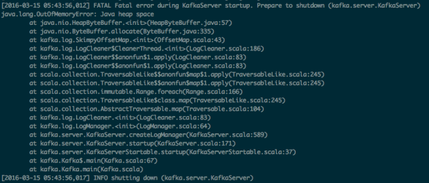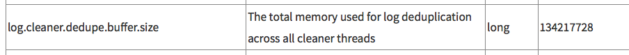 再kafka的官方文档可以查到这个 logCleanerDedupeBufferSize 默认134217728字节,128MB了。估计就是这个造成 OutOfMemory了。