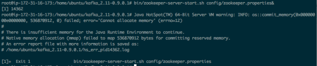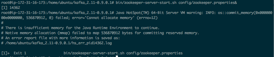 从错误输出来看,这个 zookeeper-server 要求申请536870912字节(512MB)内存 =。=#。。 日了狗了我的亚马逊主机总共才1GB物理内存而且还没建 swap 分区,free 看了一下大概就剩200MB左右的可用内存。检查这个命令的两个文件,发现在 zookeeper-server-start.sh 中有个定义 export KAFKA_HEAP_OPTS="-Xmx512M -Xms512M"。上来就要 jvm 去申请 512MB 的最小空间,把这个 Xms 改成 16M 后 zookeeper 就启动正常了。