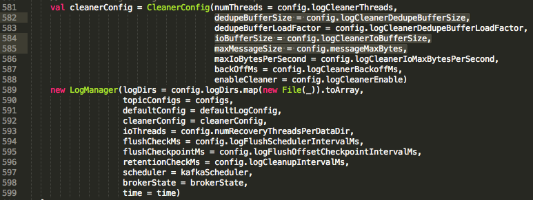 kafka 在创建 LogManager 对象的时候,使用了这个 cleanerConfig,并且用到了几个关于 size 的配置,而且这几个配置没有出现在server.properties 文件中,估计使用了默认值。