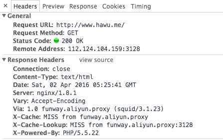 通过代理访问http://www.hawu.me,打开开发者工具中的网络窗口,检查该请求的状态,可以看到Remote Address为我们设置的代理,在Response Headers里还有我定义的代理服务器名”funway.aliyun.proxy”,表示这个请求是通过我们的代理服务器返回的。