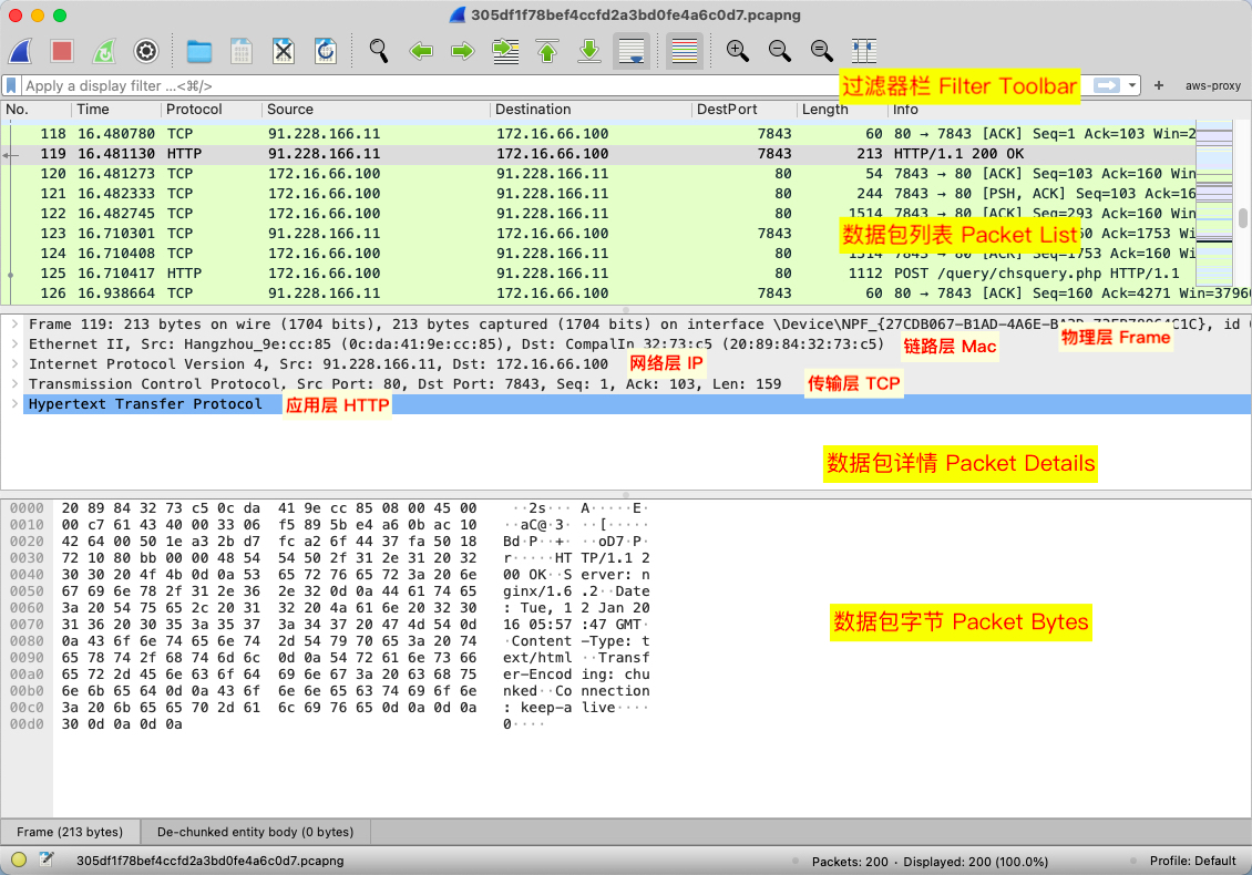 注意,数据包详情面板中展示的信息是经过 Wireshark 解析并”格式化”过的,方便阅读。最下面的数据包字节面板里才是这个包的真实数据。
