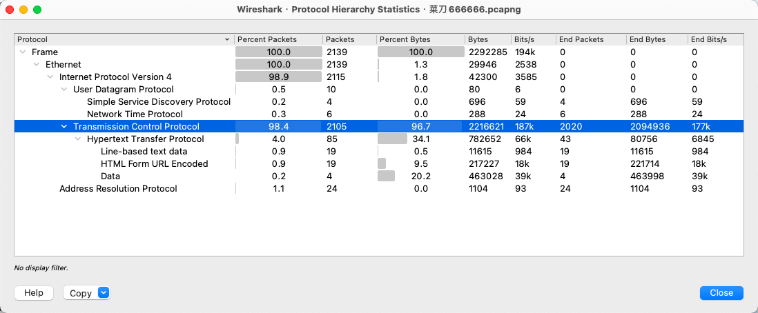 - 注意,我发现一个问题。比如说如果一个 http 包太大,被拆分成3个包。那么在包列表面板中,前两个包可能只被识别为 tcp 流量包,只有最后一个包才被识别为 http 流量包。啊不,甚至可能出现所有拆分包都只能被识别为 tcp 流量的情况。好自为之吧 🙏