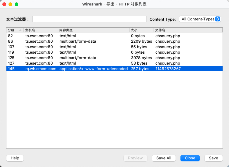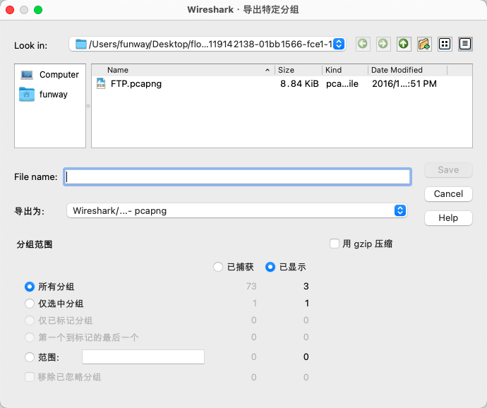 使用菜单栏中的 “文件 – 导出特定分组” 来导出筛选出来的数据包,并另存为一个新的捕获文件。