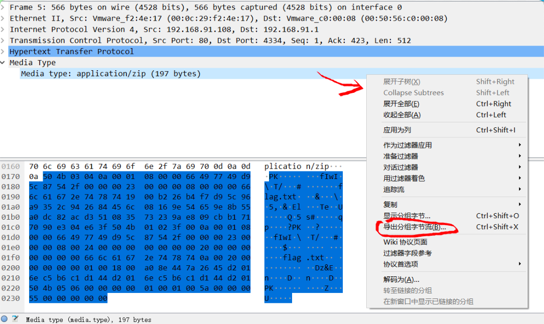 如下图所示,在 http 协议再上一层的 Media Type 上点击右键,就可以导出该 http 流中包含的业务数据(这里是一个zip包)。