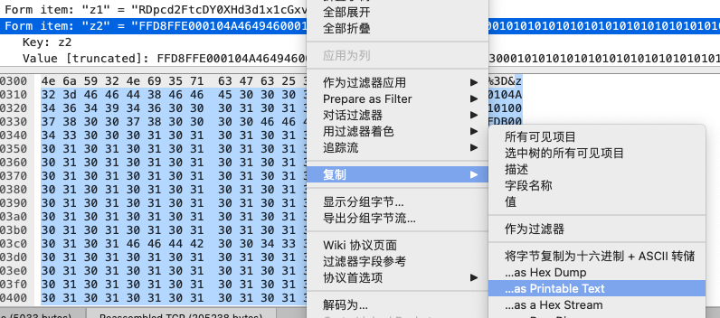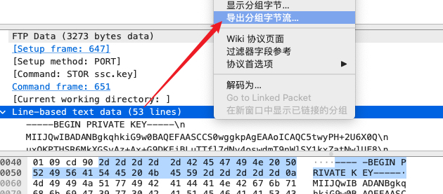 在包详情面板的某个包的某一层协议上右键”导出分组字节流”,可以很方便的将包中的二进制数据导出。