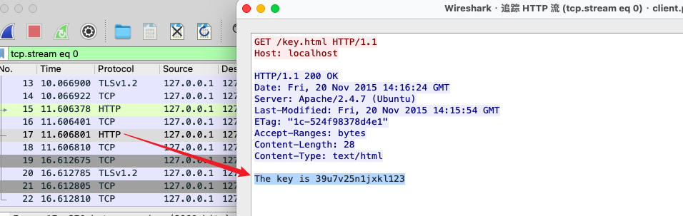 - 在上图的追踪流中发现一串长度位32的字符串,疑似哈希码。点击这一串字符,发现主窗口的包列表跳转到了数据包 [18]。