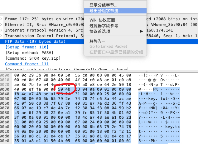 另外,我也不清楚为什么,有的题目的 ftp-data 无法通过 “导出分组字节流” 导出正确的文件,这个时候,甚至可以先通过 binwalk x.pcapng 检查一遍捕获文件,直接使用 binwalk -e 从捕获文件中导出需要的文件来。